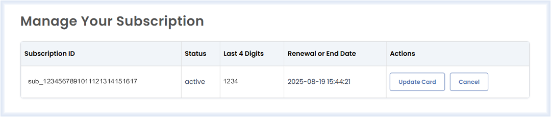 To view your subscription ID, renewal date, or to update your credit card, go to the Subscription section in your Account Settings. This page provides a summary of your active subscription, including your plan type, billing frequency, and next payment date.