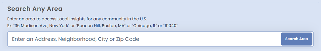 Enter any address into the search bar and click “Search Area.” Within a few seconds, our platform scans and organizes data from multiple sources to create a clean, easy-to-read neighborhood report. Reports are typically generated in under 10 seconds, but may take slightly longer due to the large volume of data.